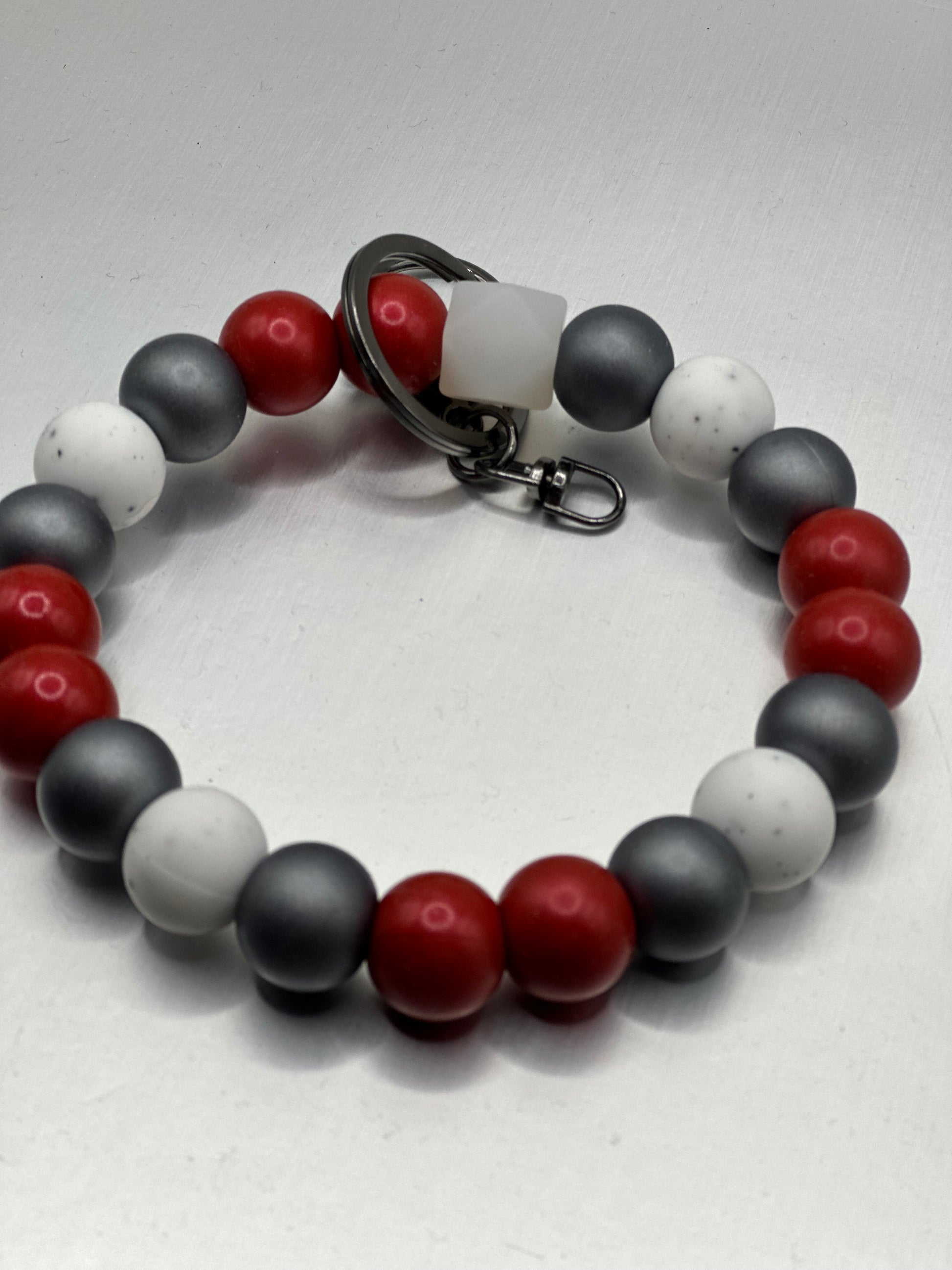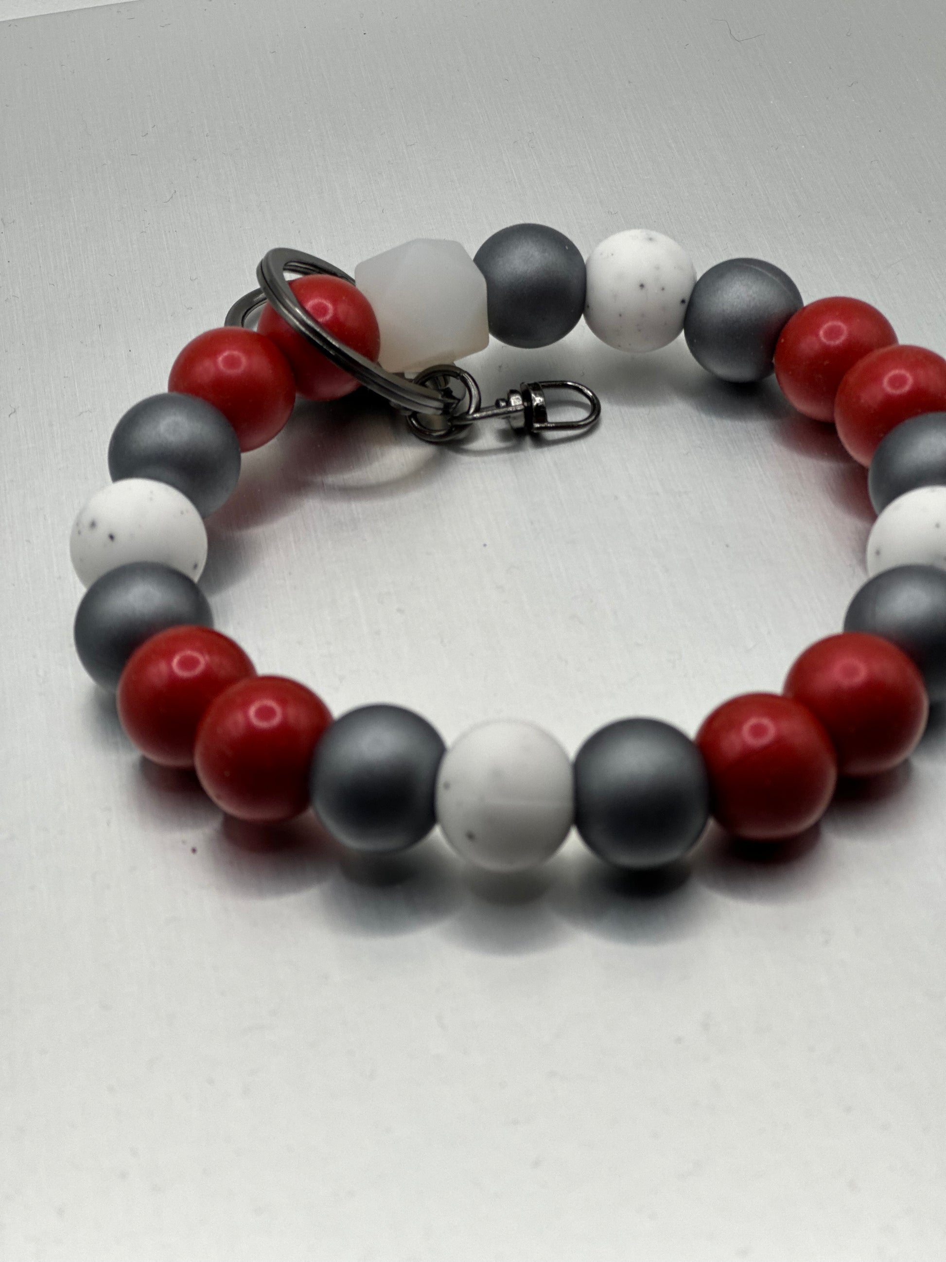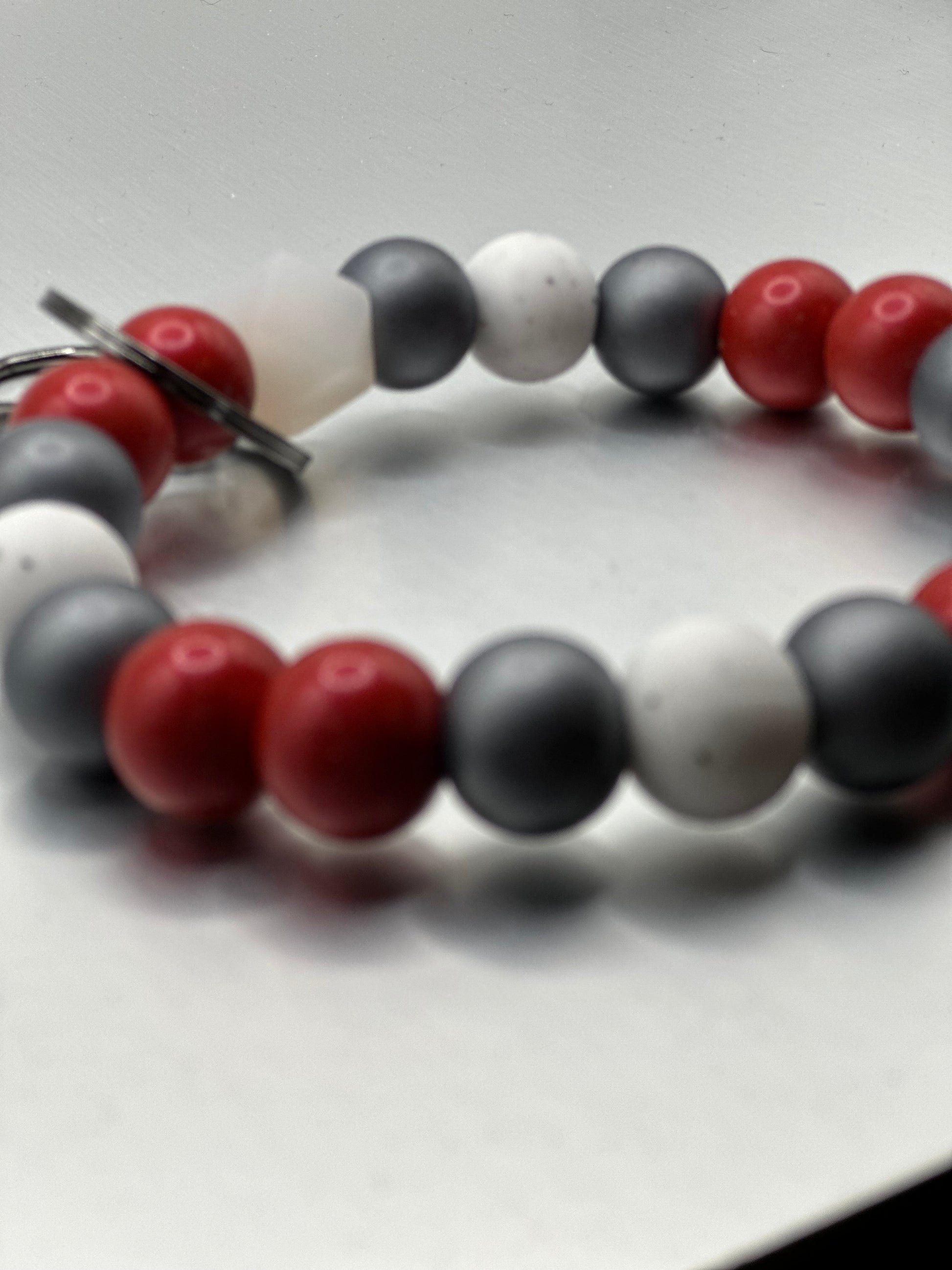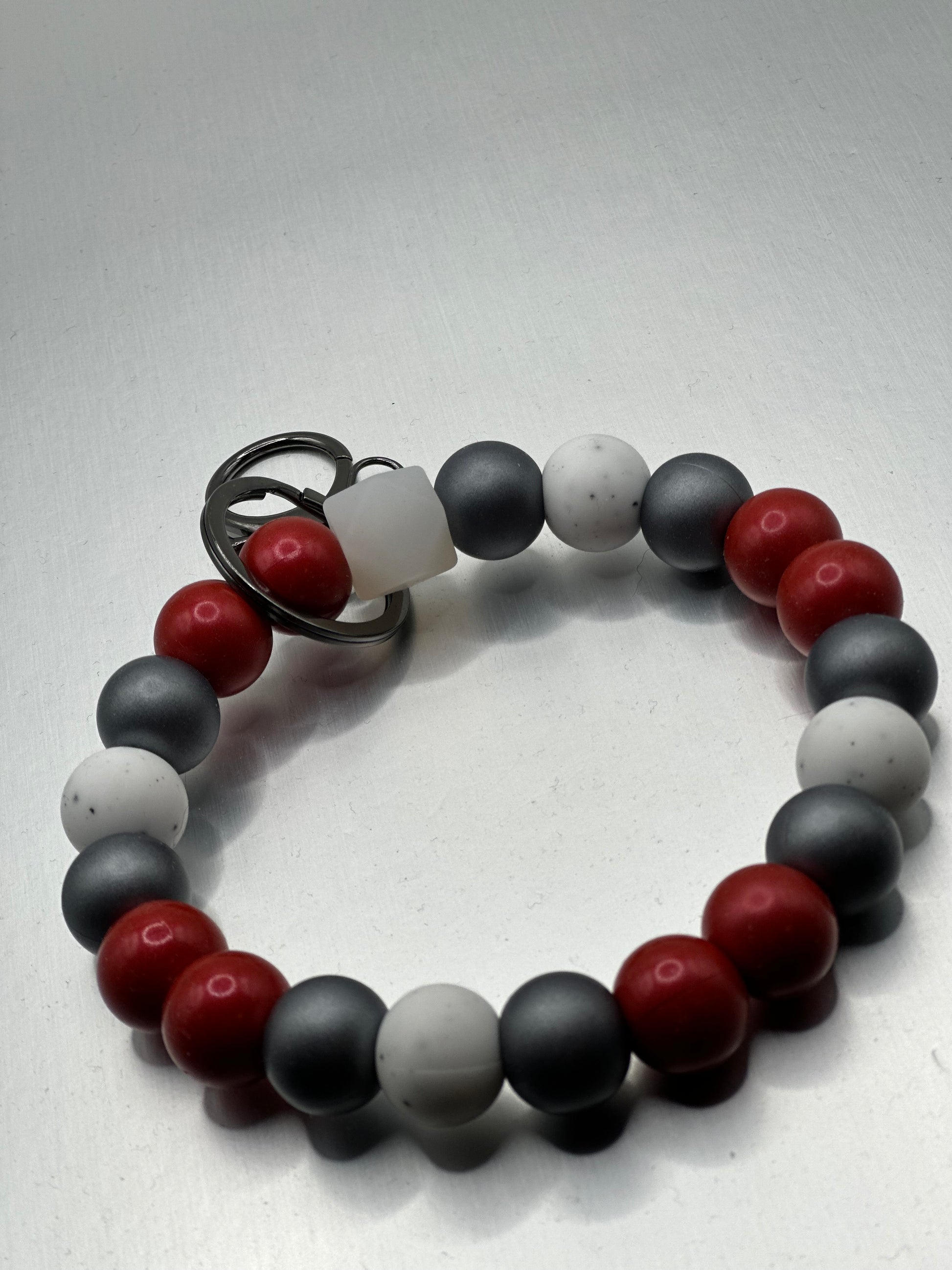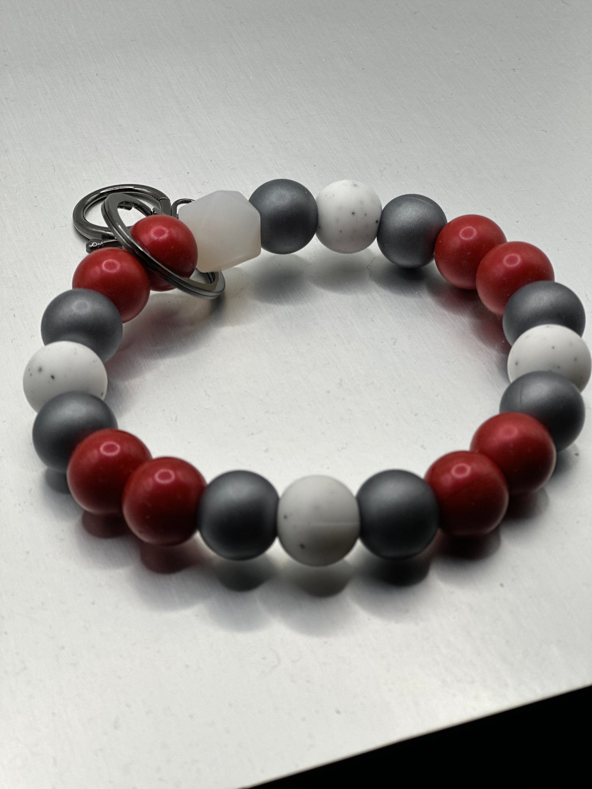 Garnet/cranberry, obsidian, and speckled white beads together with gunmetal hard wear. Limited edition for January 2025
