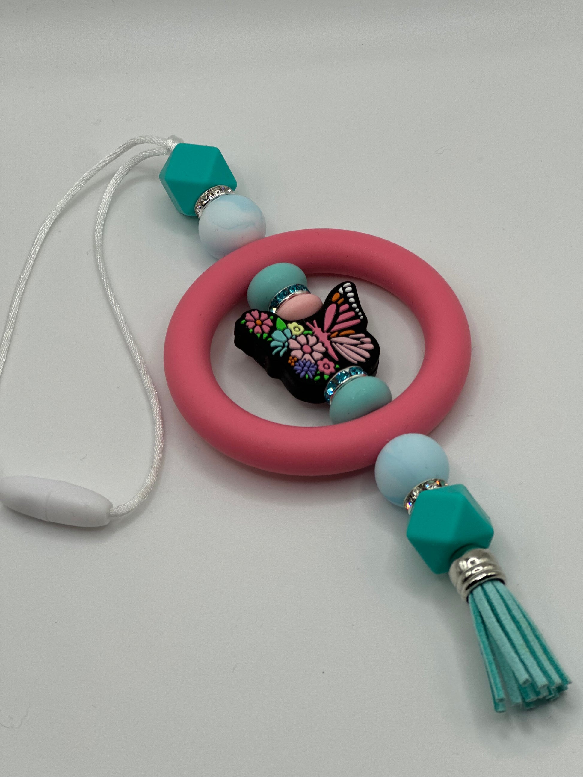 Accessorize and decorate your rear view mirror with our new Pink Butterfly Car Charm. Coordinated with a starburst pink ring and matching beads to the pink butterfly focal bead.