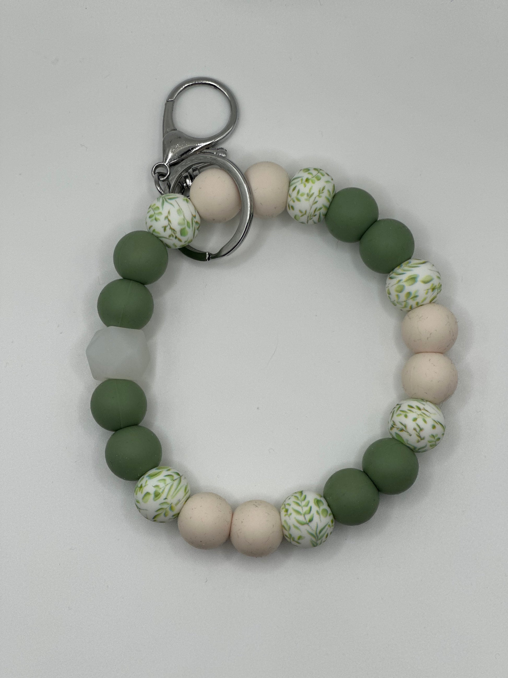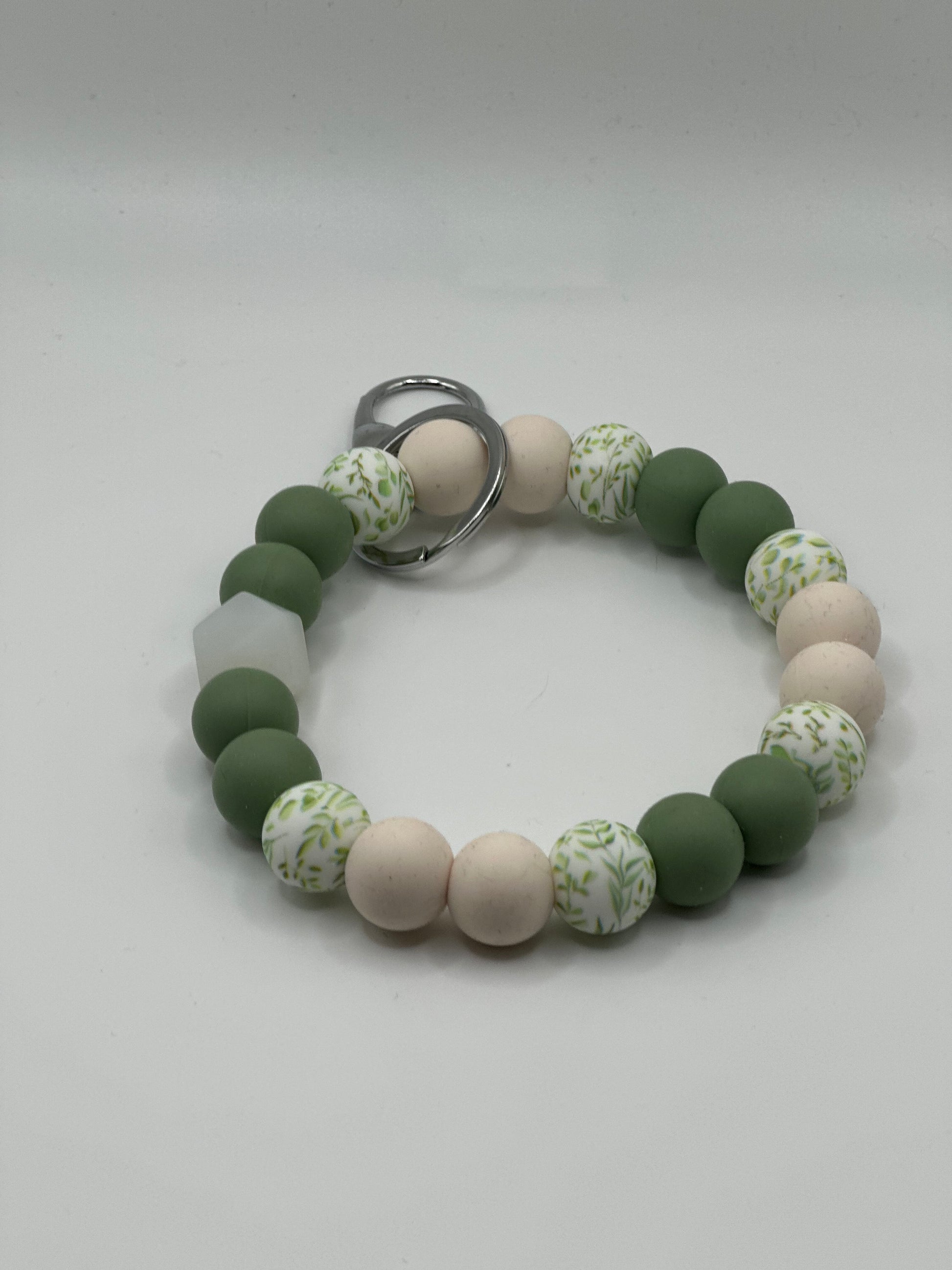 Mix of woodland green, ivory, and laurel beads with silver hardware. All wristlets also come with a glow hexagon bead so you can always find your keys even in the dark.